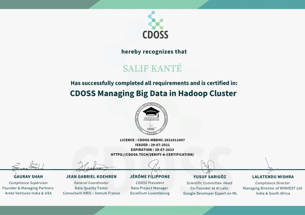 Salif KantéHas successfully completed all requirements and is certified in:CDOSS Managing Big Data in Hadoop ClusterLicence : CDOSS-mbdhc-2021021007Issued : 29-07-2021Expiration : 29-07-2021 Download certification
